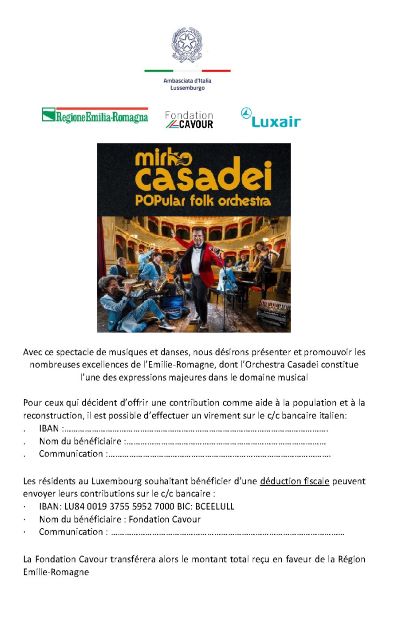 Avec ce spectacle de musiques et danses, nous désirons présenter et promouvoir les nombreuses excellences de l’Emilie-Romagne, dont l’Orchestra Casadei constitue l’une des expressions majeures dans le domaine musical